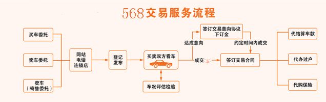通过上述任意渠道提交您的购车需求后,568将安排专业的二手车交易顾问全程为您服务,具体交易流程如下图所示: